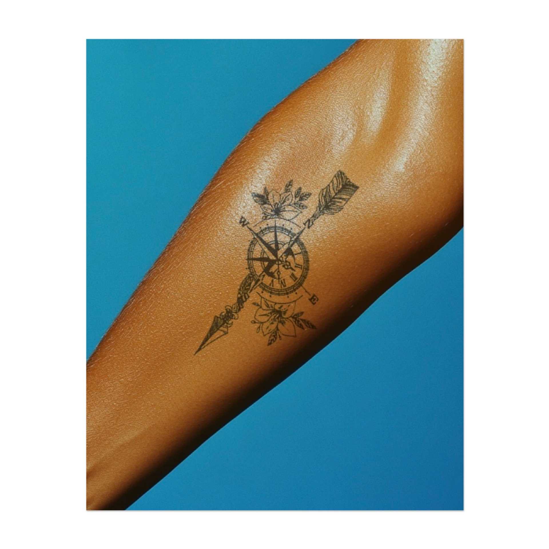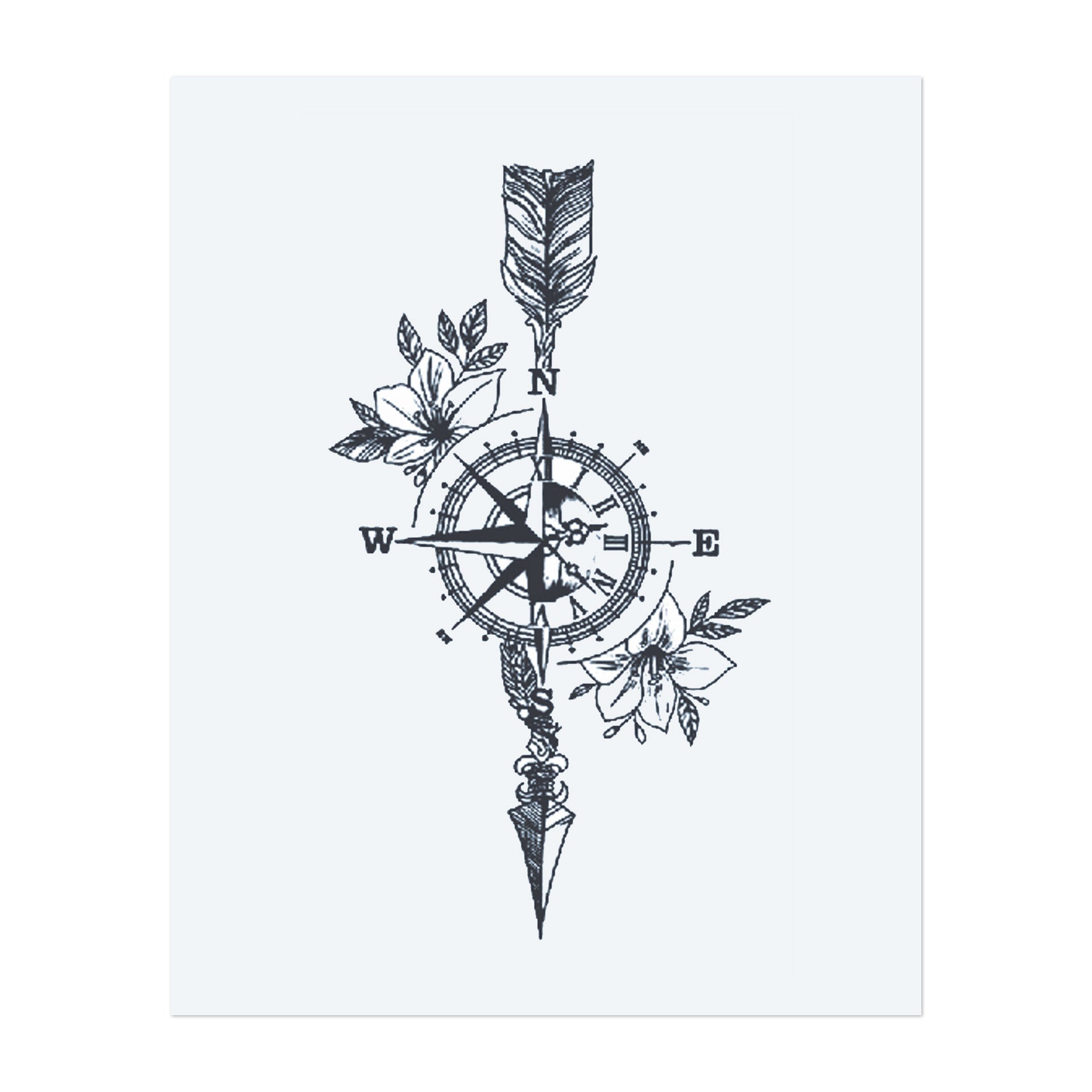 Une boussole décorée de fleurs délicates et d'une plume symbolise l'orientation, l'aventure et la beauté de la nature. Il représente un voyage à travers la vie, guidé à la fois par la direction et la sagesse de la nature.