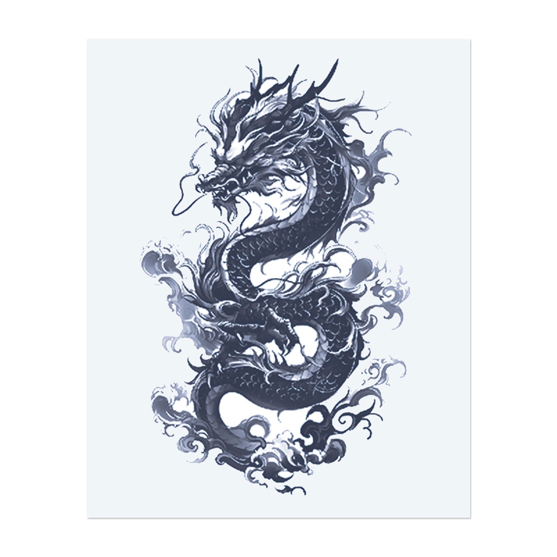 Un dragon féroce tourbillonnant dans les airs, entouré de nuages et de fumée. Son corps est couvert d'écailles détaillées et il a une expression intense et rugissante.