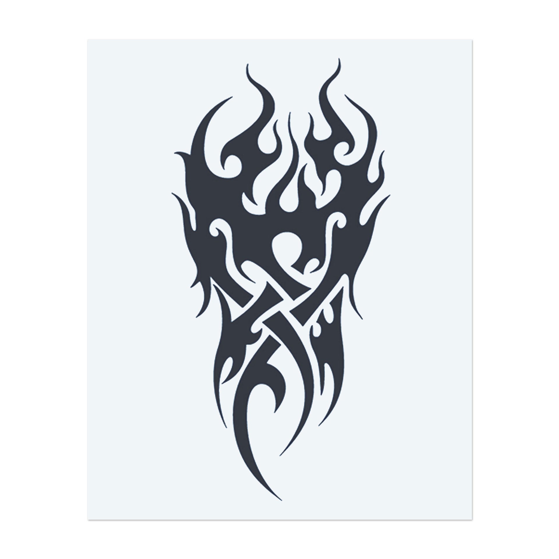 Ce tatouage présente des flammes sauvages tourbillonnant vers le haut, mélangées à des lignes nettes de style tribal. Cela ressemble à une tempête de feu, pleine d’énergie et de mouvement.