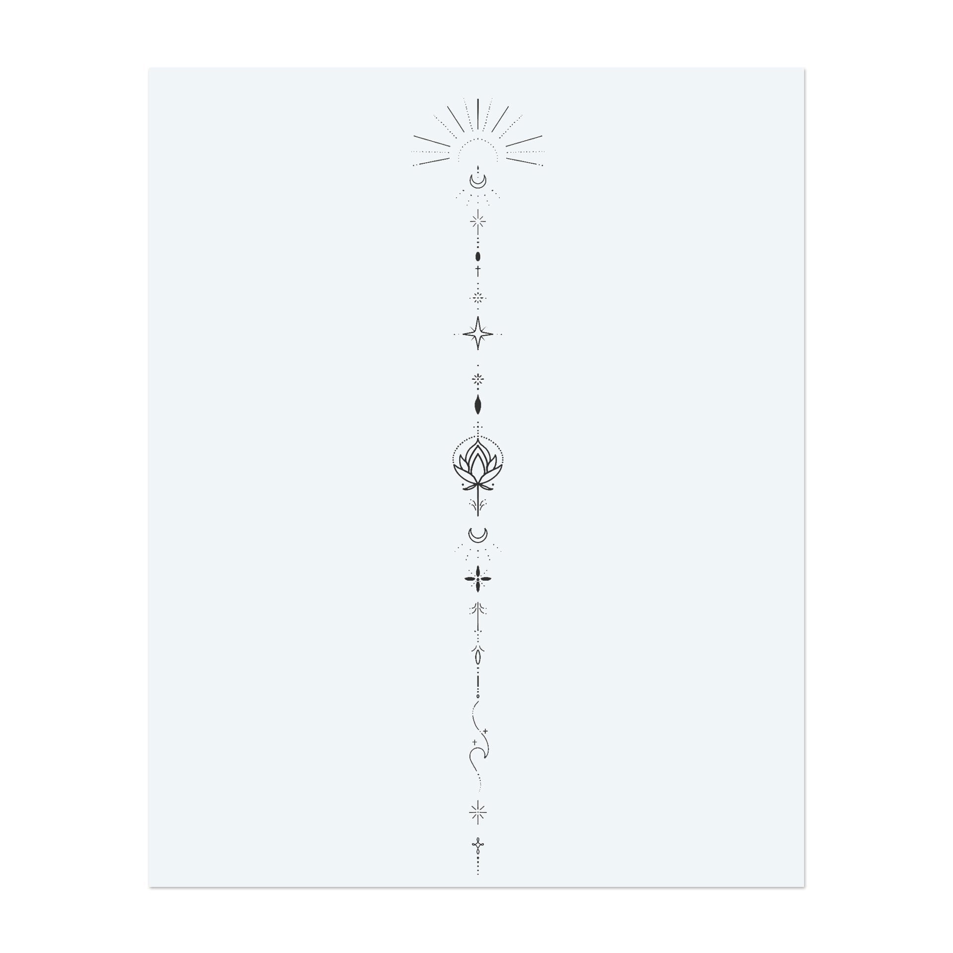Un motif délicat, aligné verticalement, représentant le soleil, la lune, les étoiles, les fleurs de lotus et de délicats ornements. Ce tatouage allie symboles cosmiques et spirituels pour former un ensemble harmonieux, idéal pour l'équilibre intérieur, la pleine conscience et la circulation de l'énergie.