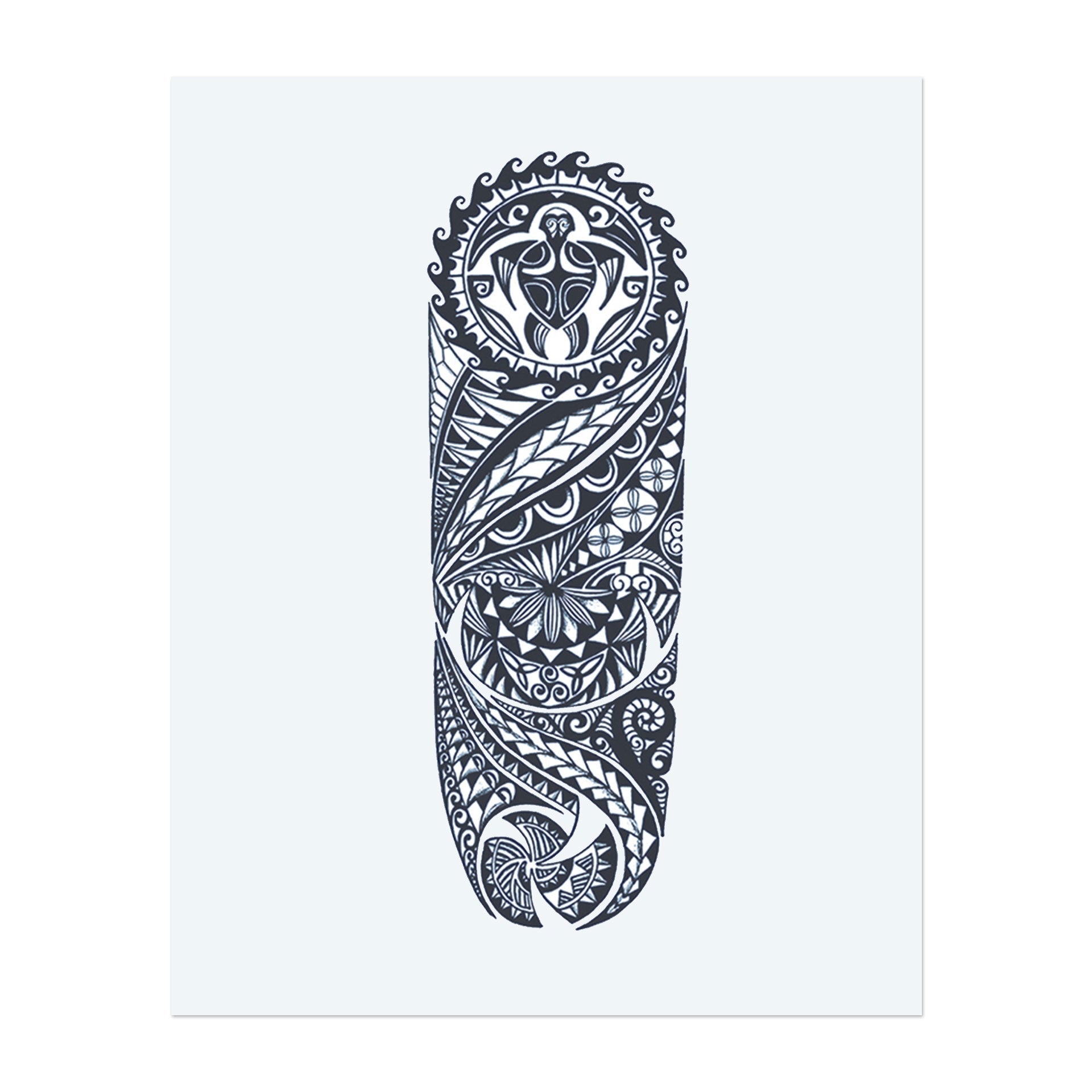 Cette pochette présente des motifs tribaux détaillés avec un motif de tortue central entouré d'éléments tourbillonnants et géométriques. Le tatouage symbolise la résilience, la protection et un lien profond avec la nature.